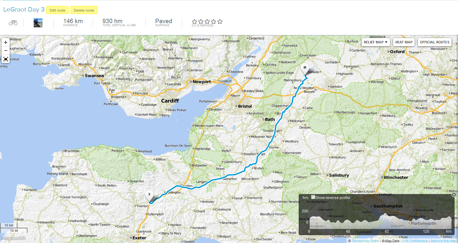 We will start on the A38 to Taunton, then use a mix of smaller A and B roads and lanes through Somerton, Castle Cary, Frome, Bradford on Avon and Chippenham. This will mean a pretty steep start over the first 12 or so miles, before levelling out with only a few small climbs later in the day.